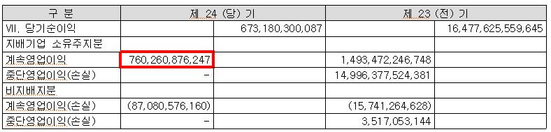 3. 좌측상단 문서목차에서 (첨부) 연결재무제표를 클릭 후 연결포괄손익계산서를 찾아보면 아래와 같이 나타납니다.