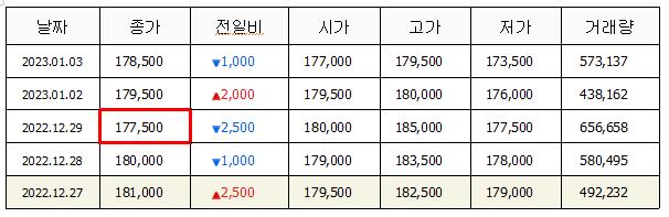 1. PER의 주가를 구해봅니다. 2022년 주가는 그 해 마지막 날 종가를 이용합니다. 2022년 NAVER 마지막 날 종가는 177,500원입니다.