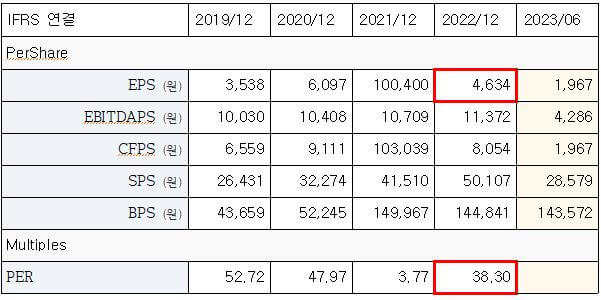 PER = 주가 / EPS = 177,500원 / 4,634원 = 38배입니다.