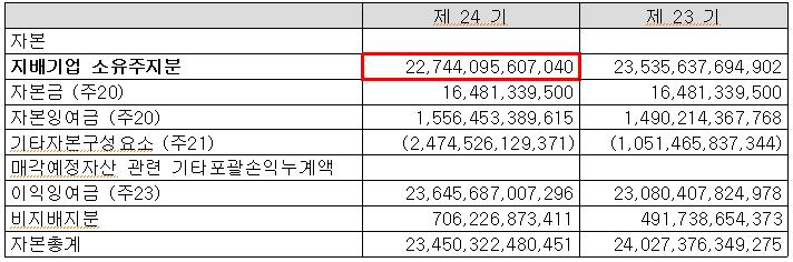 3. 연결재무상태표에서 찾아본 NAVER의 2022년 총자본은 23,450,322,480,451원이지만, IFRS도입 이후에는 좀 더 정확하게 계산하기 위해서 지배기업 소유주지분인 22,744,095,607,040원을 ROE 계산할 때 사용합니다.