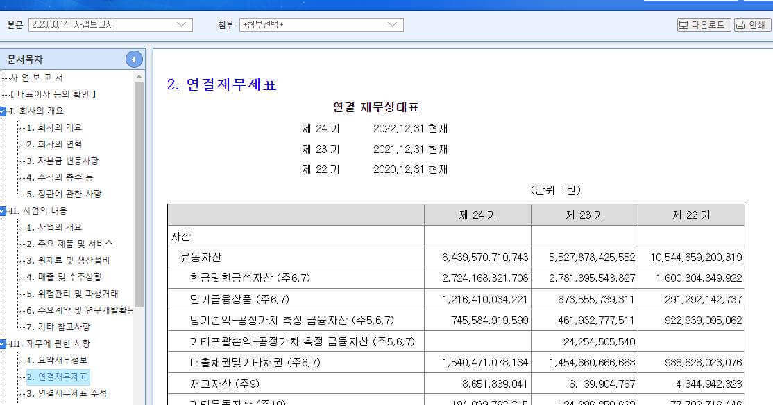 2. 사업보고서를 찾아 클릭 후 연결재무제표를 클릭합니다.